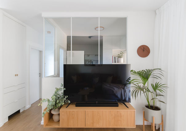 את החדר תחמנו עם חצי מחיצת זכוכית שמייצרת תחושה יותר מרווחת לכיוון הסלון.